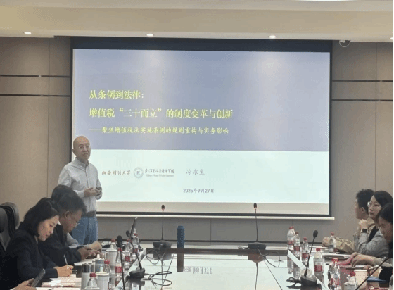 会议第二阶段在图书馆东馆二层会议室举行,由冯杰副教授主持,伟德国际1946财政与公共经济学院冷永生副教授作题为《从条例到法律:增值税“三十而立”的制度变革与创新》的专题报告,以兼具经济学与法学的双重视角,围绕“立法进程与立法技术分析”“增值税法与实施条例的体系关系”“实施条例十大规则重构与争议分析”“税务律师的业务机会与执业建议”四大维度,分享内容兼具专业性与实用性,引发与会者的热烈讨论。